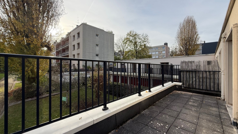 Dernier étage avec terrasse à Bellevue (25 rue Ernest Renan), au calme, à 450m de la gare et des commerces. Appartement 3 pièces dans une résidence avec parc. Il comprend: séjour, cuisine (petite), deux chambres, salle d'eau, WC indépendant. Une cave et un box agrémentent l'ensemble. Chauffage collectif, eau chaude individuelle. Honoraires: 855 euros (visite+rédaction des baux+état des lieux) / Dépôt de garantie: 1390 euros.